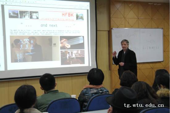 2017年1月9日下午,德国汉堡美学学院博士生导师马蒂亚斯.宁哈特教授受我们邀请在服装艺术楼南201报告厅就当今世界服装科技前沿趋势为我们研究生和留学生举办专题讲座。