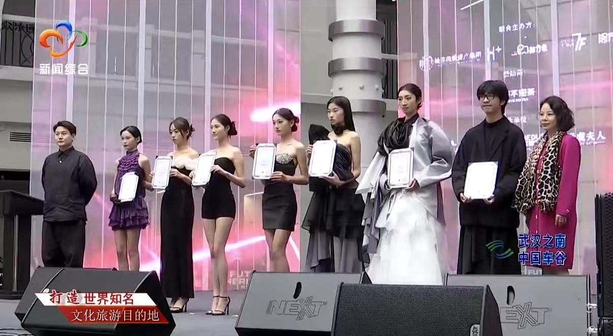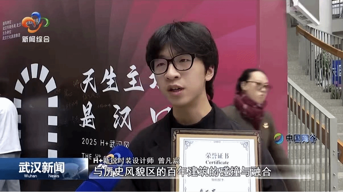 近日,我们2023级时尚品牌管理专业学生曾凡宸同学凭借服装设计作品《我见青山》,在“天生主场是汉口”2025年度H+武汉风貌旅行指南颁奖典礼暨H+青年时尚盛典中,荣获“新锐服装设计师奖”,并接受武汉新闻采访。