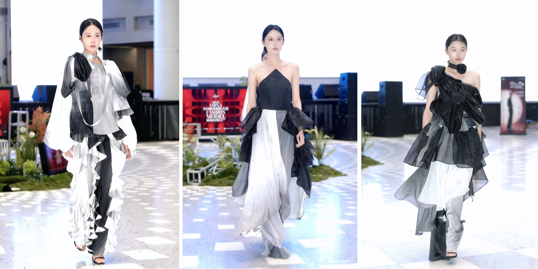 该系列在服装结构上也呼应“山水知音”主题,通过不对称剪裁与层叠设计,模拟山峦起伏与水波荡漾的自然形态,在色彩运用上,作品以不同层次的高级灰为主,辅以墨色与月白,通过渐变与晕染手法,营造出远山如黛、流水含烟的视觉韵律。灰色系象征山石的沉静与永恒,浅灰与留白则暗合水波的流动与空灵,整体色彩语言在虚实之间取得平衡,传递出超然物外的宁静氛围。青年设计师用服饰的色、型、韵来表达服饰的质感与叙事性,使穿着者仿若行走在青山水畔,感受身心与自然合一的精神场域。