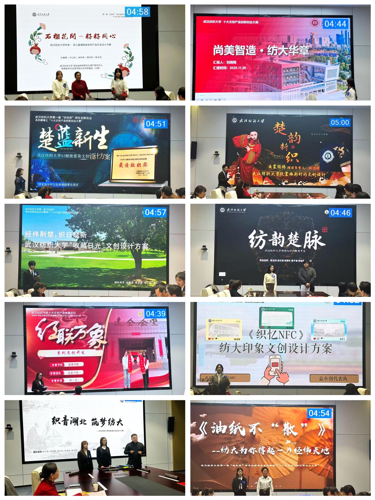 经过激烈的角逐,共评出十项“十大文创产品创新奖”、十项“十大文创产品创新奖”及4项“创新创业学院logo入围奖”。最终由教育部中华优秀传统文化传承基地(汉绣)和必赢bwin网址大全共同选送的《石榴花开·籽籽同心:传承匠心国潮家具系列产品开发》、必赢bwin网址大全选送的《尚美智造·纺大华章:纺织文化主题文创设计方案》、管理学院选送的《红联万象:纺大主题文创设计方案》、伯明翰时尚创意学院选送的《经纬荆楚·织日赋新:“收藏日光”文创设计方案》、创新设计学院选送的《织音湖北·筑梦纺大:知音湖北文创设计方案》等10项作品获得“十大文创产品创新奖”;由外国语学院选送的《楚风织语——纺大手机壳盲盒文创设计方案》、马克思学院选送的《纺承红色根脉·织续革命精神:纺大精神赋能红色文化文创设计方案》、纺织科学与工程学院选送的《“织光照未来”文化书灯》、机械工程学院选送的《顶经纬·传楚魂——巨能顶神兽文创设计方案》等10项作品获得“十大文创产品提名奖”。另外,必赢bwin网址大全选送的《纺锤·创芯:创新创业学院LOGO设计方案》、传媒学院选送的《青梭·蓝枢——创新创业学院LOGO设计方案》等4项作品获得“创新创业学院logo设计入围奖”。