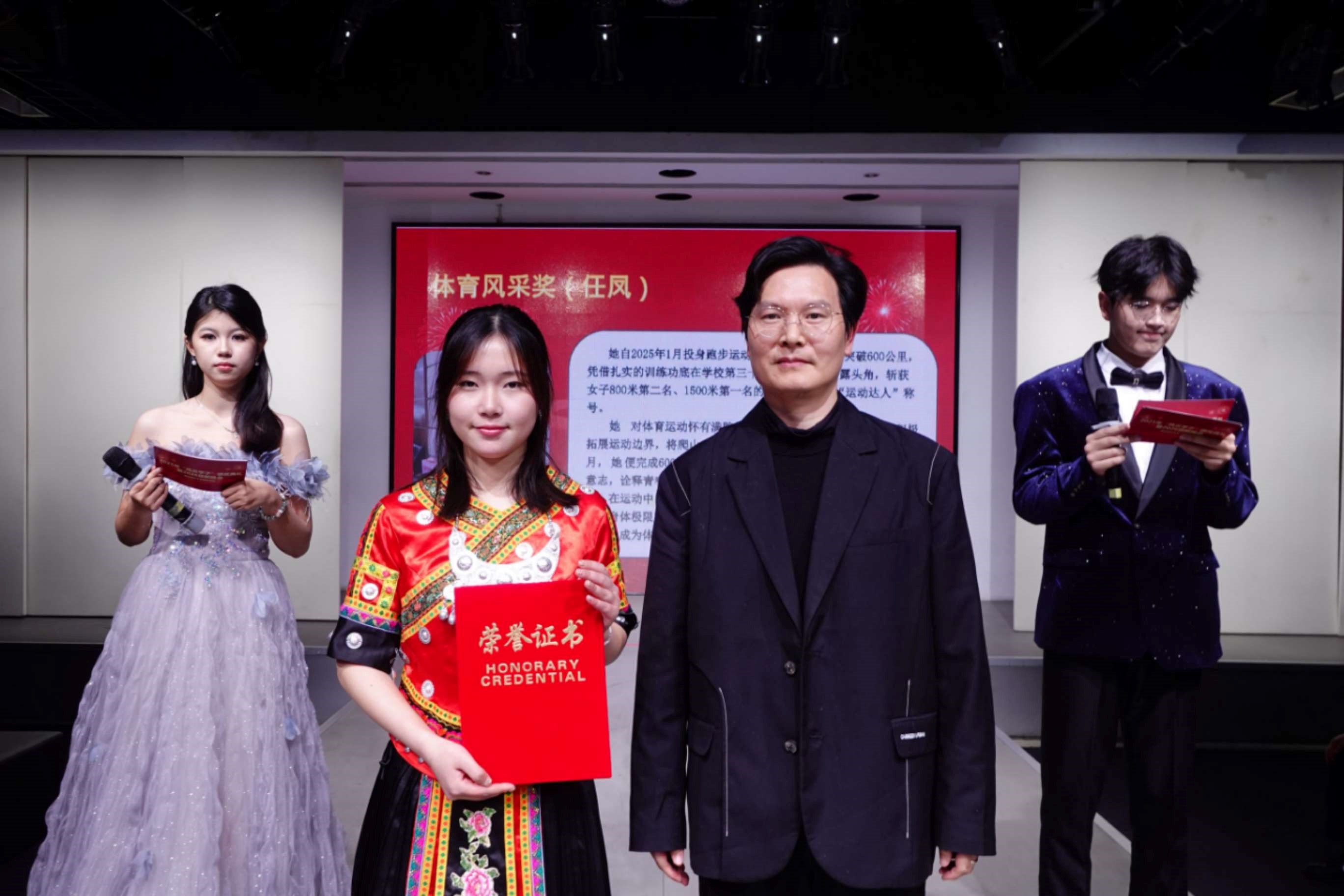 晚会现场,激昂的颁奖曲悠扬响起,亲临现场的老师为获奖学子郑重颁发荣誉证书,这份荣誉不仅见证了他们日夜伏案苦读的钻研、反复打磨的执着,更承载着学院对青年一代“守正创新、笃行致远”的殷切期许。当颁奖环节在崇敬的目光与热烈的掌声中不断推进,穿插其间的新年晚会节目轮番登场,将学子们的青春活力与创意才华展现得淋漓尽致。歌曲、舞蹈、京剧、朗诵等精彩表演一次次将现场气氛推向高潮,为这个荣耀之夜增添了无限的活力与欢笑。