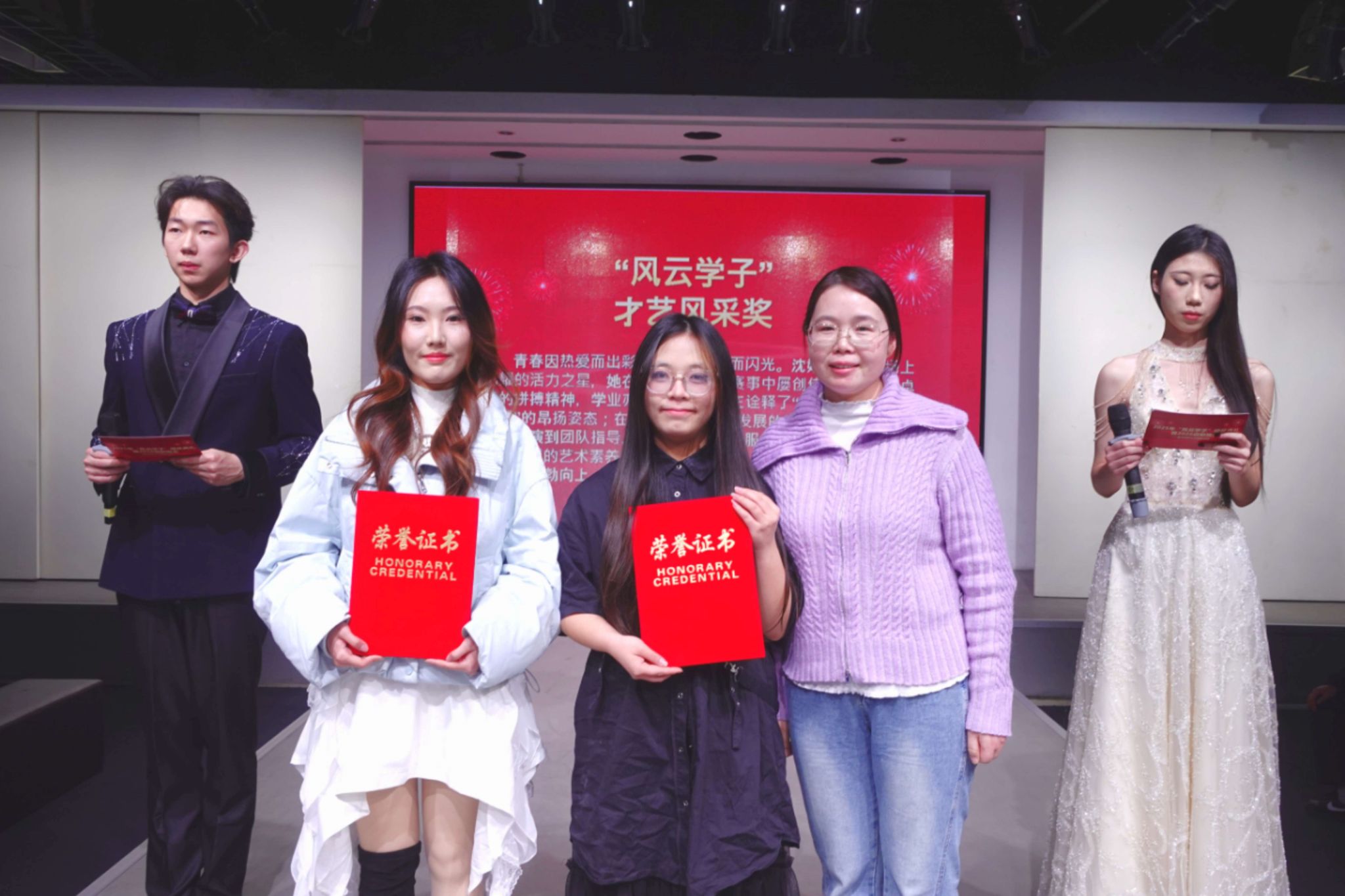 2025年12月30日18时30分,必赢bwin官方网站南湖校区表演厅内星光闪耀、掌声雷动。必赢bwin网址大全2025年度“风云学子”颁奖典礼暨2026年新年晚会在此隆重举行。研究生部(处)副部长马晓锋,学生工作部(处)副部长夏贤辉,必赢bwin网址大全党委书记杜新年、院长陶辉教授、副院长江学为教授、副院长钟蔚教授、党委副书记郭泰辰、服设三系主任张元美副教授,服工系主任张俊副教授,表演系主任田甜,办公室主任胡琳琳,实验室主任吴胡和出席晚会,学院辅导员、班主任老师们和服装学子们参加了晚会。