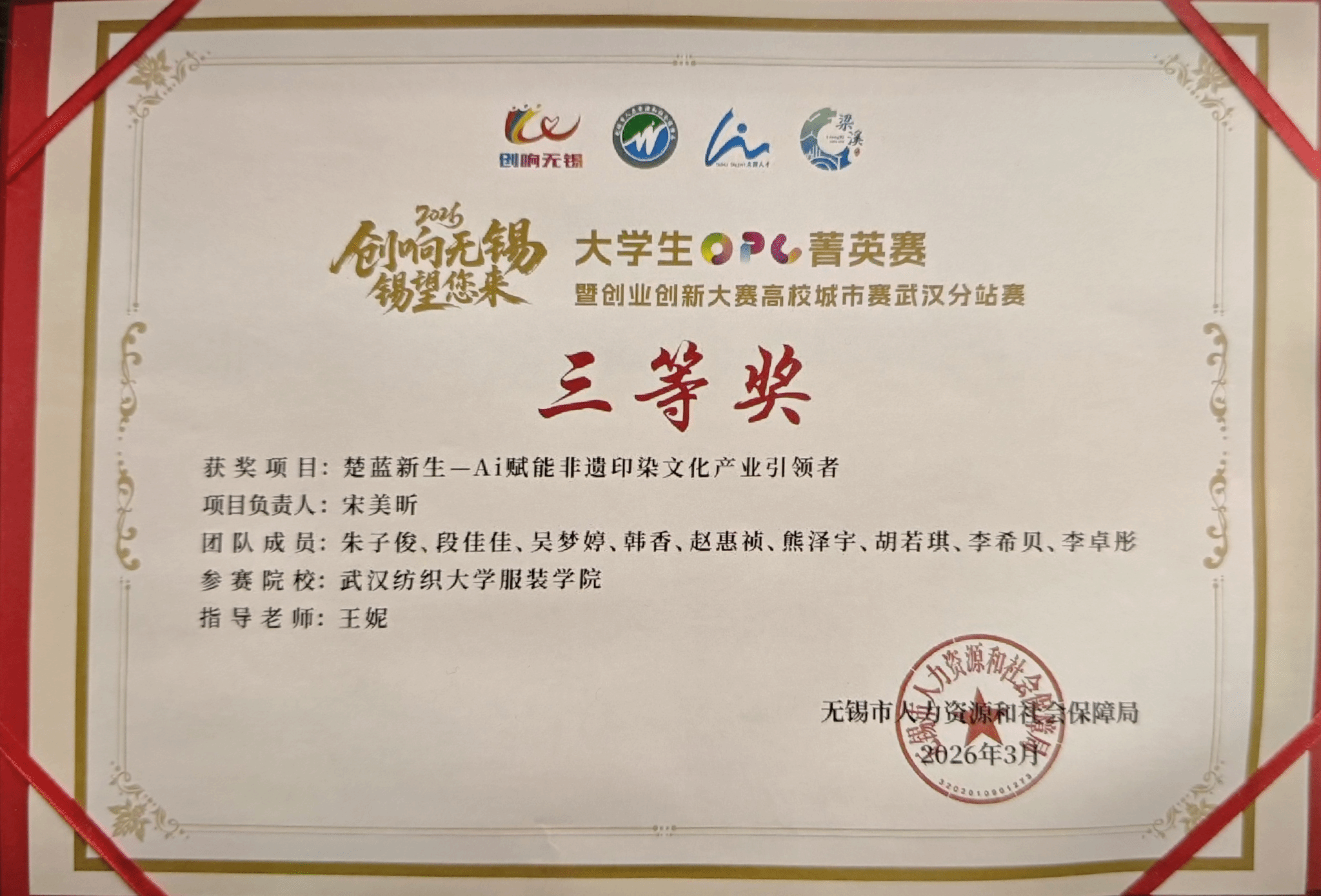 本次大赛由无锡市人力资源和社会保障局、梁溪区人民政府联合主办,采用“5+4+1”紧凑赛制,赛场竞争尤为激烈。宋美昕团队在导师王妮的指导下,以AI技术为核心解决非遗印染的传承与创新难题,为千年楚蓝工艺赋予数字时代新生命力,凭借清晰的商业逻辑、真挚的文化情怀,以及精彩的路演与答辩表现,赢得评委一致认可。