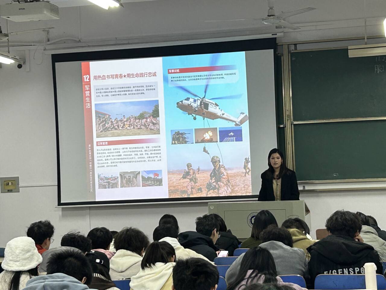 11月24日,必赢bwin网址大全在综合楼108举办2026年春季征兵政策宣讲会,学校武装部征兵入伍宣讲员、22级优秀退役士兵杨佳慧担任主讲,2023级同学参加。